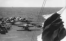 With "Taffy 3" helplessly overmatched, the entirety of Taffy 2's aircraft was recalled to join the defense. Marcus Island only had a single Avenger available, as the rest had been sent to airdrop supplies to the 96th Division. By the time these Avengers returned, the battle had already concluded.[14] Nonetheless, Marcus Island dispatched all her available aircraft, and her sole Avenger recorded a torpedo hit on the portside aft of what was probably the Tone-class cruiser Chikuma. Her fighters strafed and bombed the advancing Japanese ships, recording fourteen hits and shooting down five Japanese planes. Marcus Island was also obliged to refuel and rearm seven Avengers originating from "Taffy 3" which had been diverted.[10][15]