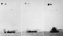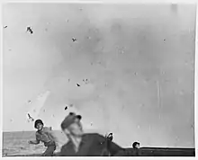 At 8:22, three kamikaze Zeros were spotted approached Marcus Island from the port quarter, at about 15,000 ft (4,600 m) in altitude, when one Zero disappeared into a cloud, and the other two reoriented themselves towards her. One Zero crossed over the carrier towards her starboard quarter, whilst the other one made a steep bank to remain at her port. The first kamikaze skimmed over her flight deck, making impact with the water just 20 ft (6.1 m) off her starboard bow, glancing a lookout platform and killing one. Scarcely ten seconds after the first attack, the second Zero dove on Marcus Island, but careened into the water 30 ft (9.1 m) off her port bow. As it entered the water, its bomb detonated, spraying shrapnel across the flight deck and injuring six of her crew.[10][19] A few minutes later, a Yokosuka D4Y dive bomber attempted to make a run against Marcus Island, but it missed with its bomb and was shot down.[20] Marcus Island was able to continue her air support operations on Mindoro.[10][21]