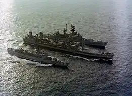 The jumboized USNS Mispillion refueling USS Leahy (CG-16) and USS Sample (FF-1048), 1980