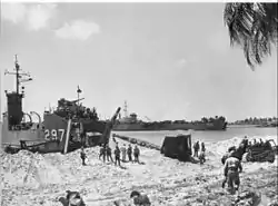 USS LSM-297 and LST-1041 beached while unloading equipment, date and place unknown.