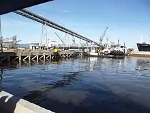Nuestra Señora De Los 33 in the port of Nueva Palmira, just visible on the opposite side of the dock at left-center of the photo.