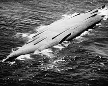 Badly damaged by the loss of a propeller, the ship sailed to Rosyth under heavy escort for repairs on 15 October. At 01:00 the next morning, a U-boat launched three torpedoes at the damaged vessel, all of which passed ahead of her.[21] Unlike in previous cases, sufficient evidence existed to suppose that this torpedo attack was not a false alarm—a number of officers and men aboard New York clearly saw the wakes of the torpedoes in the full moonlight, and a submarine was spotted in the immediate vicinity by a patrol shortly after the attack.[22][Note 1] Ironically, the battleship's wounded condition is possibly what saved her: although standard procedure was to steam at 16 kn (18 mph; 30 km/h), New York could make only 12 kn (14 mph; 22 km/h) on her one operable propeller. Due to this, historian Jerry Jones believes that the U-boat captain misjudged the ship's speed. With no further damage, however, the battleship arrived safely at a drydock in Rosyth. As she was lifted clear of the water, a large dent commensurate with a submarine bow was found in her hull.[22]