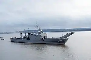 Saginaw was renamed HMAS Kanimbla (L 51) in Australian service and commissioned into the Royal Australian Navy on 29 August at Norfolk, Virginia. Kanimbla underwent conversion in May 1995 at Forgacs Shipbuilding, Newcastle, New South Wales. The LST was significantly modified by removing its bow ramps and adding another deck over the bow of the ship, allowing for a third landing spot and increased aviation fuel capacity. Over the new deck two LCM-8 landing craft were carried when the third landing spot was not in use, and were handled by a 70-ton crane. Improved medical facilities were also constructed. A hangar was installed aft, allowing for the stowage of four Seahawk helicopters.[16][17] Kanimbla was based at Sydney, Australia.[17] Kanimbla was taken out of service in November 2011 and replaced by HMAS Choules and the Canberra-class landing helicopter docks.[18] Kanimbla was towed back to the United States in October 2013 and arrived in New Orleans, Louisiana, for scrapping by Southern Scrap Recycling.[11]
