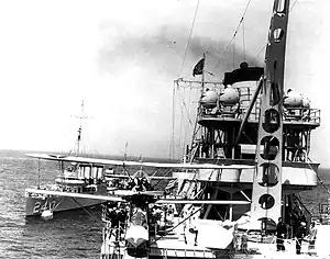 On board heavy cruiser Indianapolis looking aft from the forward superstructure as Sturtevant comes alongside, during the Presidential fleet review off New York City on 31 May 1934.