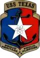 The official crest of USS Texas CGN 39 was designed by Martha Bell, a freelance graphic designer from Texas. The colors—red, white, and blue—represent the state flag of Texas. The anchor and the fouled line symbolize the Navy, while the Lone Star signifies the state of Texas. The atoms and orbits within the Lone Star represent the nuclear power characteristics of the ship. The three stars at the bottom represent the past United States ships named "Texas". The motto, "Proud Heritage, Proud Purpose", refers to the history and legacy of those ships, and their purpose: defense of the United States.