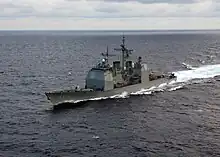 The guided missile cruiser USS Vicksburg (CG-69) cruises the Atlantic Ocean preparing for an early underway replenishment with the fast combat support ship USS Seattle on 11 June 2004