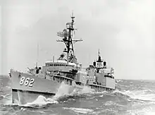 Vogelgesang was decommissioned and stricken from the Naval Vessel Register on 24 February 1982, transferred to Mexico and renamed Quetzalcoatl (E-03). In 1993, the ship had a single Bofors 57 mm gun mounted in "B" position, between the forward 5 inch mount and the ship's bridge.[1] Also during that year, the ship was renamed Ilhuicamina with the pennant number E-10,[2] although by 2002 the ship had reverted to the name Quetzalcoatl.[1] In 1994,[lower-alpha 1] the ASROC launcher and anti-submarine torpedo tubes were removed.[2] In 2001, the ship again changed Pennant number, to D 101.[1] She was decommissioned by the Mexican Navy in late 2002. On 24 November 2006, the ship was scuttled to form an artificial reef. Her main tripod mast is on display in Mexican Pacific Fleet headquarters, Mexico.