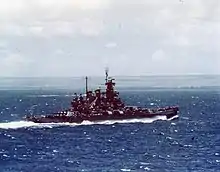 While patrolling off the island in the early hours of 1 February, Indiana cut in front of Washington to go refuel a group of destroyers, causing the latter to ram the former and significantly damaging both ships. Washington had some 200 ft (61 m) of bow plating torn from her bow, causing it to collapse.[29] The two vessels withdrew to Majuro for temporary repairs; Washington's crumpled bow was reinforced to allow her to steam to Pearl Harbor on 11 February for further temporary repairs. After arriving there, she was fitted with a temporary bow before continuing on to the Puget Sound Navy Yard in Bremerton, Washington, for permanent repairs.[7] Another new set of screws was installed and in April, Washington conducted vibration tests that revealed a partial solution: the ship could now steam at high speed without significant issues, but vibration was still excessive at speeds between 17 and 20 knots (31 and 37 km/h; 20 and 23 mph).[4] Once the work was completed, the ship joined BatDiv 4 and took on a group of 500 passengers before departing for Pearl Harbor. She arrived there on 13 May and disembarked the passengers and proceeding back to the fleet at Majuro. On arrival on 7 June, she resumed her service as now-Vice Admiral Lee's flagship.[7]