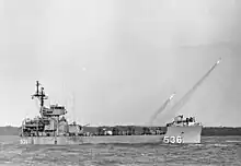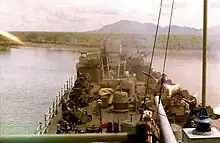 USS White River (LSMR-536) (later LFR-536) was a Landing Ship Medium (Rocket) (LSMR) in service with the US Navy between 1945 and 1946, 1950 and 1956, and 1965 and 1970. As a member of the LSM(R)-501-class Landing Ship Medium (Rocket), White River was designed to provide rocket fire support to US and allied amphibious operations, although in South Vietnam she was generally used to bombard enemy formations and installations.[2] She saw combat in the Korean and Vietnam Wars, making a large contribution to the latter, in which she fired tens[3] to hundreds of thousands[4] of rockets in support of American, South Vietnamese, and South Korean operations against the Viet Cong[4][5][6] during ten tours of duty in Vietnam, 1966 through 1969.[7] In Navy publications such as All Hands and the Navy Times, as well as in the recollections of crew, forward observers and spotters, and ground forces receiving her support, White River was reported to have the firepower of six destroyers[4][8] or a cruiser.[9] She could fire 250 65-pound (29 kg) rockets in a minute, plus 5-inch shells and autocannon fire, and carry a magazine of 1,500-2,000 rockets.[4][7]