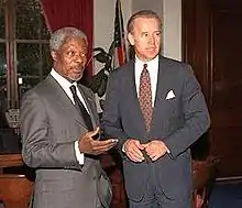Biden became interested in the Yugoslav Wars after hearing about Serbian abuses during the Croatian War of Independence in 1991.[40] Once the Bosnian War broke out, Biden was among the first to call for the "lift and strike" policy of lifting the arms embargo, training Bosnian Muslims and supporting them with NATO air strikes, and investigating war crimes.[40][97] The George H. W. Bush administration and Clinton administration were both reluctant to implement the policy, fearing Balkan entanglement.[40][98] In April 1993, Biden spent a week in the Balkans and held a tense three-hour meeting with Serbian leader Slobodan Milošević.[102] Biden related that he had told Milošević, "I think you're a damn war criminal and you should be tried as one."[102] Biden wrote an amendment in 1992 to compel the Bush administration to arm the Bosnians, but deferred in 1994 to a somewhat softer stance the Clinton administration preferred, before signing on the following year to a stronger measure sponsored by Bob Dole and Joe Lieberman.[102] The engagement led to a successful NATO peacekeeping effort.[40] Biden has called his role in affecting Balkans policy in the mid-1990s his "proudest moment in public life" related to foreign policy.[98]