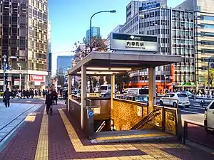 Uchisaiwaicho Station (内幸町駅, Uchisaiwaichō-eki) is a railway station on the Toei Mita Line in Uchisaiwaichō, Chiyoda, Tokyo, Japan. Its station number is I-07.