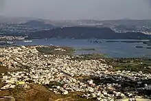 Udaipur (Hindi: IPA: [ʊdəjpʊɾ], pronunciation) (ISO 15919: Udayapura) is a city and municipal corporation in Udaipur district of the state of Rajasthan, India.[3][4] It is also known as the 'City of Lakes' [5] and serves as the administrative headquarters of Udaipur district. It is the historic capital of the kingdom of Mewar in the former Rajputana Agency. It was founded in 1559 by Udai Singh II of the Sisodia clan of Rajputs,[6] when he shifted his capital from the city of Chittorgarh to Udaipur after Chittorgarh was besieged by Akbar. It remained as the capital city till 1818 when it became a British princely state,[6] and thereafter the Mewar province became a part of Rajasthan when India gained independence in 1947.[7]