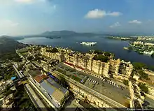 Dubbed "the most romantic spot on the continent of India" by British administrator James Tod,[9] Udaipur is a tourist destination and is known for its history, culture, scenic locations and the Rajput-era palaces. It has seven lakes surrounding the city. Five of the major lakes, namely Fateh Sagar Lake, Lake Pichola, Swaroop Sagar Lake, Rangsagar, and Doodh Talai Lake, have been included under the restoration project of the National Lake Conservation Plan (NLCP) of the Government of India.[10] Besides lakes, Udaipur is also known for its historic forts and palaces, museums, galleries, natural locations and gardens, architectural temples, as well as traditional fairs, festivals and structures.[11] Due to the several lakes present here, it is sometimes dubbed "Venice of the East".[12][13] Udaipur economy is primarily driven by tourism, though minerals, marble processing, chemical manufacturing and development, electronic manufacturing and the handicraft industry are also contributors.[14] Udaipur hosts several state and regional public offices, including offices of Director of Mines and Geology, Commissioner of Excise, Commissioner of Tribal Area Development, Hindustan Zinc Limited, and Rajasthan State Mines and Mineral Corporation Limited. Besides, Udaipur is rising as educational hub as well, with 5 Universities, 14 colleges and more than 160 high schools.[14] Udaipur is home to IIM Udaipur, the fifth best management institution in the country according to NIRF ranking released by the MHRD.