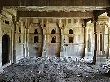Directly east of Nīlakaṇṭheśvara is a large palace complex known as Shāhī Maḥal, which served as the residence of the local governor during the Mughal rule.[11] Built on a rectangular plan, the maḥal has four corner towers and a two-storey elevation, with a suite of rooms disposed around two interlinked courtyards, all decorated in the simple and elegant stonecarving style of the 17th century. The existing ruins retain traces of excellent stone jālī work. Forming an adjunct of the maḥal is a big mosque, an imposing edifice locally known as Shāhī Masjid or Qāḍiyon-kī-Masjid.[11][12] A Persian inscription carved on a slab measuring 65 x 42 cm, affixed on the central mihrab of the mosque, records its foundation by Qāḍi Awliyā b. Sayyid ʿAbd al-Ṣamad al-Ḥasanī on 4 Rajab 1026 Hijrī, or 28 June 1617 CE, at the time when Emperor Jahāngīr was on a visit to Mandu.[12] A second Persian inscription carved on a slab measuring 4'1" x1', in a balcony projecting from the north wall of the mosque records that the mosque was only half complete when both king and qāḍi passed away, and that it was finally completed by Sayyid Ḥāmid and Sayyid Dāʾūd, sons of Qāḍi Awliyā, on 10 Dhū'l-Ḥijja 1041 Hijrī, or 18th June 1632 CE, during the reign of Emperor Shāhjahān.[13] Both inscriptions show that this mosque served as the main Jama Masjid of Udaypur in the Mughal period and was the seat of the town's state-appointed qāḍi. The epigraphs are also significant for the political geography of the times, showing that qasba Udaypur was then part of sarkar Chanderi and suba Malwa, on the border of Gondwana.[13]