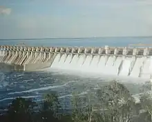 The Ujjani Dam commissioned in June 1980 is an earth cum concrete masonry dam, which has created a multipurpose reservoir. The total length of the dam is 2,534 m (8,314 ft), which comprises a central portion which is the spillway dam of 602 m (1,975 ft) length, of concrete gravity section of 56.4 m (185 ft) (maximum height above the deepest foundation level). The spillway is flanked by Non Overflow (NOF) concrete gravity dams of 314 m (1,030 ft) length. Earth dam sections flank the NOF dams on the left and right banks. The volume content of the dams is 3.320 km3 (0.797 cu mi). The gross storage capacity created is 3.320 km3 (0.797 cu mi) at the Full Reservoir Level (FRL) of 497.58 m (1,632.5 ft).[1] The spillway, structure has an Ogee shaped downstream slope designed to dispose a design flood discharge of 15,717 m3/s (555,000 cu ft/s) (the maximum probable flood discharge of 18,013 m3/s (636,100 cu ft/s) and a breaching section is provided between the NOF block and the earth dam section, controlled by 41 radial gates of 12 m (39 ft)x6.5 m (21 ft) size erected over the crest of the dam. In addition, four river sluices (gate controlled) are also provided in the body of the spillway pier numbers 3, 4, 5 and 6 with outlet level at 470 m (1,540 ft), with each sluice designed for a discharge capacity of 60 m3/s (2,100 cu ft/s) for silt flushing. The energy dissipation arrangements on the downstream slope of the spillway is in the form of high level and low level slotted roller bucket type. Measuring instruments have been installed in the body of the dam to record and analyse various parameters related to the behaviour of the dam over the years as part of the dam safety programme[1][4] The dam is founded on massive basaltic rock formations.