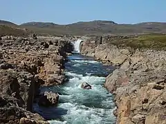 In addition to a reversing waterfall and over 500 archeological sites, including an old Hudson's Bay Company (HBC) trading post, the region is home to such species as polar bears, grizzly bears, Arctic wolf, barren-ground caribou, seals and peregrine falcons. Vegetation in the park is typical low tundra, with dwarf birch, willow and mountain avens. Scattered patches of boreal forest can be encountered in river valleys.