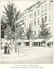 An U. praestans E. Schoch, cultivated in Europe in the late 19th century and said by Krüssmann (1984) to have originated in Belgium, was equated by him with U. × hollandica 'Superba'.[10] A 1907 photograph shows an avenue of elms in Magdeburg, Germany, described as U. praestans E. Schoch, a "hybrid between U. scabra [U. glabra] and U. campestris [U. minor]" – i.e. as a form of U. × hollandica.[11] A 'Superba' was reputed by Louis Späth to have been "much esteemed as a street tree in Magdeburg" – presumably the clone in the photograph.[12] This suggests that Späth regarded U. praestans as synonymous with 'Superba'. A 'Superba' had appeared in Späth's catalogues from 1885,[12] from descriptions[13] probably the large-leaved U. montana superba of Morren, not U. praestans. Späth's catalogue of 1911–12 erroneously claimed that U. praestans E. Schoch was synonymous with Morren's U. montana superba.[14] Hartwig, who received specimens of U. praestans from Kiessling of the Magdeburg city nursery in 1908, said (1912) that "Ulmus montana superba, supposedly the same [as U. praestans], looks quite different when young, being wide with large, broad, dull green leaves, whereas U. praestans and U. glabra fastigiata show an elongated medium-sized shiny green leaf and densely pyramidal crown". He concluded that U. praestans was not Ulmus montana superba, but was indistinguishable in leaf or habit from U. glabra fastigiata Kirchner.[15] Späth admitted the error in an article in Möller's Deutsche Gärtner-Zeitung (1912),[16] confirming that U. praestans E. Schoch was a U. × hollandica hybrid, and implying that Morren's tree was a form of U. montana (Wych Elm). He corrected the error in his later catalogues, distinguishing between Morren's Ulmus montana superba and U. praestans E. Schoch (for which he adopted Henry's synonym Ulmus superba Henry), and marketing both cultivars in the interwar period.[17][12] U. superba Henry was a 'Superba' from Späth himself, planted at Kew in 1900, which Henry had described in 1913.[12] This confirms that Späth had also been marketing U. praestans as 'Superba' in the late 19th century. An undated herbarium specimen from Haarlem showing a hybrid cultivar labelled "U. × hollandica 'Superba' Rehd., received as U. praestans from Späth, Berlin" (see 'External links') matches Henry's description of Späth's tree planted in 1900 at Kew.