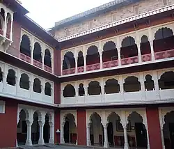 In 1930, the architect George Devon was engaged to expand the palace to provide accommodation for the future maharadja Bhim Singh II (1909 – 1991) and his bride.[3] The architect took great care to blend the new parts with the old parts designed by Samuel Jacob.[3] This part of the palace is still used by the royal family of Kota.[3]