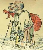 In yōkai depictions, they are depicted looking like a giant biwa hōshi standing above the sea holding a rod in the right hand and carrying a pipa on their back.[1] There is no accompanying explanatory text in the Gazu Hyakki Yagyō or Hyakki Yagyō Emaki, so it is unknown what kind of yōkai this was intended to be. The yōkai researcher Murakami Kenji considers it a yōkai that has existed only in these paintings.[2]