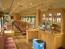 Designed by Eiji Mitooka and Don Design and Associates, the train's theme is that of a "toy resort train made of wood" and is clad in obisugi cedar within and without. The refurbished train cars previously ran on Takachiho railway.[3][1] The decor features motifs and traditional wooden toys from Miyazaki prefecture.[4]