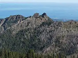 This landform has also been called "Unicorn Peaks",[3] and "The Pinchers",[4] as in crab pinchers. This refers to the appearance of the summit and a 5,050-foot-elevation peak on the peak's northeast aspect, which is known as "Unicorn Horn".[4] Klallam legend has it that during a great flood, canoes were tied to the mountaintop which broke off leaving only the two peaks, and the canoes and people in them floated to where Seattle is located.[4]