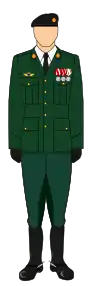 The final design was decided in 1968 and resemblances to the American Green Service Uniform.[67] It meant that the peaked cap was removed from service, except for the General Corps, who retained the M/52 cap, however with a colour change to fit with the M/69 uniform.[69][70] The M/69 is designed with 5 gold buttons (silver for HESK), two breast pockets and two lower pockets. It is worn with either a beret or a stiff forage cap for some officers.[71] The pants worn with it are a darker shade of green with a black stripe down the outseam.[70] The uniforms also features a black tie, black socks and shoes, and a white shirt. The tie was changed in 2000, from a woolen tie, to a standard tie.[42] All M/69 feature insignia denoting the branch of service on their lapel.[70] proficiency badges and tabs can be donned on the M/69 uniforms.[72]