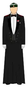 The Snorefrakke (or Snorekappe for the cavalry)[63] is an all black Dolman. It can be traced back to 1858, and was meant to serve as an alternative to the standard uniform jacket.[48] In 1923, it was changed to serve as an alternative to the standard mess dress, a function that continues to this day.[63][50] It is worn with blue full-dress pants and a kepi, it not allowed to wear medals on the uniform, only ribbons.[64]