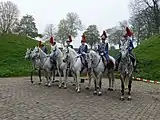 The uniforms still possess the sabretache which is in the colours of the regiment, with the royal monogram. It is the only uniform in the world to still use it, and has been in use since the reign of Frederick V.[54]