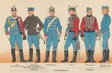 The full dress uniform is the most elaborate and traditional uniform worn by the Royal Danish Army. All ceremonial dresses apart from the Guard Hussar Regiment's and Royal Life Guards', can be traced back to the standardization in 1848, where all services were given coats in the same cut.[11] With these coats, the infantry, engineers and artillery wore dark blue coats while the cavalry wore light blue.[11] The uniforms are however, less common today, as it was withdrawn from general issue in 1964, when it was no longer compulsory for officers to own a full dress uniform.[48] However, personnel serving as aide-de-camp to the Monarch, Generals, the Judge Advocate General and the Commandant of Copenhagen are required to own a full dress uniform.[49]