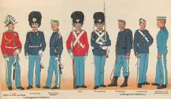 In 1842, the standardized uniform was presented throughout the Army.[9] The standardized uniform retained the red coat and introduced light blue pants for all.[9] The unique regimental colours were removed and replaced with standards of the flag of Denmark, making it was harder to differentiate between the regiments. This led to all the regiments being given numbers, which would then be placed on the shoulder-straps.[10] In 1848, the red coat was exchanged with a Double-breasted dark blue jacket, and the cumbersome shako was replaced with a more practical kepi.[10][11] In 1880, the uniforms saw minor updates, along with a colour change of the hats, which had been made dark blue a few years prior.[9][10]