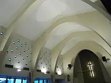 The church was subsequently rebuilt (fourth generation building) on the site of the third generation building.[2] The Fellowship Hall and the manse[6] were completed in 1949, the Sanctuary and its bell tower in 1955 and the Annex in 1970.[4] The sanctuary was built in minimalist modern style with references to the Bauhaus school. Internally, it featured transverse arches in Art Deco style.[2]