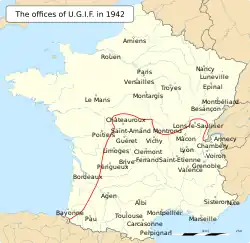 The General Union of French Israelites (French: Union générale des israélites de France, UGIF) was a body created by the antisemitic French politician Xavier Vallat under the Vichy regime after the Fall of France in World War II. UGIF was created by decree on 29 November 1941 following a German request, for the express purpose of enabling the discovery and classification of Jews in France and isolating them both morally and materially from the rest of the French population.[1] It operated in two zones: the northern zone, chaired by André Baur, and the southern zone, under the chairmanship of Raymond-Raoul Lambert.[2]