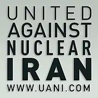 United Against Nuclear Iran (UANI) is a bi-partisan, non-profit advocacy organization in the United States. Its stated objective is to "prevent Iran from fulfilling its ambition to become a regional super-power possessing nuclear weapons."[1] Along with other advocacy campaigns, the organization leads efforts to pressure companies to stop doing business with Iran as a means to halt the Iranian government's nuclear program and its alleged development of nuclear weapons.