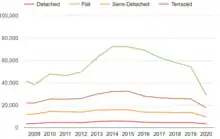 In December 2019, UK Finance, the Building Societies Association, and the Royal Institute of Chartered Surveyors introduced the requirement for an External Wall Fire Review (EWS1) of blocks 18 metres or taller to assess whether a property contained potentially dangerous materials.[22] The next month, the UK government issued guidance that all buildings with an external wall system should be assessed for safety.[21] A successful EWS1 test was intended to enable sales, but the vast number of properties for which lenders were seeking EWS1 forms and the lack of professionals qualified to undertake the assessments entrenched the collapse in sales both of risky buildings and of buildings which, while not risky, nonetheless lacked an EWS1 report.[21][16][22][23] The number of properties needing an EWS1 form was roughly halved in November 2020 by a Government agreement with the relevant bodies that requirements for an EWS1 could be made less stringent.[2][24][25]