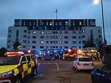 Although reporting focused on residential buildings, other types were also affected, such as the 52-bed trauma unit at the John Radcliffe Hospital, Oxford, which closed temporarily due to concerns over flammable cladding on the building and other "serious and embedded" fire safety issues.[12] It was also immediately apparent that some buildings had fire-safety issues other than cladding. For example, in August 2017, four 13-storey tower blocks built in 1968 to 1970, containing 242 flats, on the Ledbury estate in Peckham had their gas supplies cut off as a precaution: in the event of a gas explosion, they could be at risk of collapse, since they used the same "large panel system" as Ronan Point. That had partly collapsed in May 1968 after a small gas explosion in a flat knocked out a load-bearing exterior wall.[13]