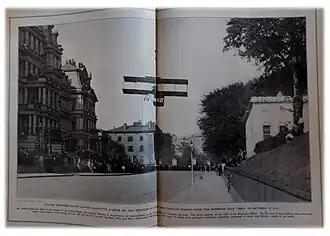 Both the Boston Daily Globe and the United States Aeronautical Reserve's (U.S.A.R.'s) The Air-Scout covered Grahame-White landing an airplane near the War Office in Washington, D.C. in October 1910. It was a distance and speed demonstration display, with the U.S.A.R. requesting Grahame-White to perform the test in front of hundreds of military personnel that stood outside and watched as he successfully landed his airplane in a narrow street within a few minutes from a satisfactory distance.
