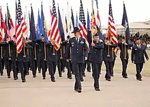 The Mess dress uniform is worn to formal or semi-formal occasions such as dinings-in and dinings-out, the annual Air Force Ball, weddings and other formal functions where civilian "black tie" would be prescribed. The current mess dress uniform in use since the early/mid-1980s consists of a dark blue mess jacket and mess dress trousers for males and a similar color evening-length skirt for females; as of August 2020, females have the option to wear mess dress trousers.[15] The jacket features ornate silver buttons, and is worn with the service member's awarded medals in miniature size, wings in miniature size, or other specialty insignia over the left breast, command insignia over the right breast for colonels and below (if applicable), satin air force blue bow-tie for males or tab for females, and a satin air force blue cummerbund. Cufflinks can be either shined or flat round silver or have the air force star and wing emblem. Dark blue suspenders may also be worn, but remain hidden while the jacket is on. Commissioned officers, USAFA and AFROTC cadets, and OTS officer trainees wear hard shoulder boards similar to those worn by commissioned officers of the U.S. Navy. Commissioned officer shoulder boards for colonels and below feature an officer's rank insignia in raised metallic thread, bordered by two silver vertical metallic stripes similar to sleeve braid. General officers wear shoulder boards covered nearly the entire length and width in a silver metallic braid, with silver stars in a raised metallic thread in number appropriate to their rank. Enlisted personnel typically wear the same large rank insignia that they would wear on their service dress coats. Officers also wear a single silver metallic sleeve braid on the lower sleeves of the Mess Dress coat, with sleeve braid coming in two widths, in a 1/2 inch width for colonel and below, and in a 3/4 inch width for Brigadier General and above. Enlisted personnel normally wear no sleeve braid. No hat or nametag is worn with the Air Force Mess Dress Uniform.[14]