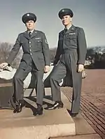 The first Air Force-specific blue dress uniform, introduced in 1949, was in Shade 1683, also dubbed "Uxbridge Blue" after the former Bachman-Uxbridge Worsted Company.[1][2] It was cut similarly to Army service dress uniforms, with a four button front and four coat pockets. Replacement of polished brass devices with oxidized silver ones and lack of sewn unit insignia on the dress uniform were designed to reduce needless tasks and present a sleeker appearance. An Eisenhower jacket, also inherited from the Army Air Forces but in Shade 1683, was an optional uniform item; it was phased out by 1965. In the early 1960s, the blue uniform transitioned to a slightly updated version in Shade 1084. The shades were updated again in the 1970s, with the coat and trousers becoming Shade 1549, while the light blue shirt became Shade 1550.