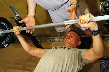 U.S. Army Specialist (SPC) Brian Buss, 3rd Battalion, 187th Infantry, performs incline bench presses, with a spotter, at the gym tent provided by the Morale Welfare Recreation (MWR) staff on Kandahar Air Base, Afghanistan, during Operation Enduring Freedom.