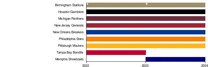Eight teams were announced on November 22, 2021,[49] all feature the names and colors of USFL teams that existed in 1984: Michigan Panthers, New Jersey Generals, Philadelphia Stars and Pittsburgh Maulers in the North Division and Birmingham Stallions, Houston Gamblers, New Orleans Breakers and Tampa Bay Bandits in the South Division.[50] The Bandits were replaced in the 2023 season by the Memphis Showboats, in conjunction with the league agreement to play at Simmons Bank Liberty Stadium.[51]