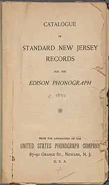 - ↑ Catalogue of Standard New Jersey Records. Newark, N.J.: United States Phonograph Co. c. 1894.