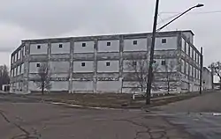 The southern building is rectangular and two stories tall, measuring 223 feet (north-south) by 132 feet (east-west). The south façade is made of structural concrete and terra cotta block. The eastern façade contains three large freight openings for truck loading. Most of the building has been painted white.[2]