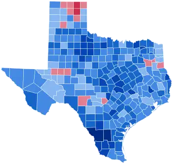 | Nueces | 40,426 | 74.10% | 14,048 | 25.75% | 84 | 0.15% | 26,378 | 48.35% | 54,558 |