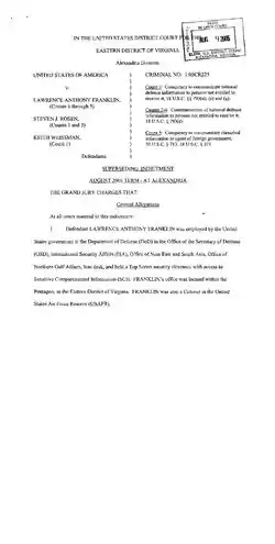 2. 1 2 3 4 5 6 US vs Franklin, Rosen, & Weissman, 2005, US District Court for the Eastern District of Virginia, Grand Jury Indictment.