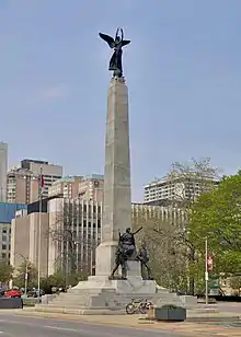University Avenue is a major north–south road in Downtown Toronto, Ontario, Canada. Beginning at Front Street West in the south, the thoroughfare heads north to end at College Street just south of Queen's Park. At its north end, the Ontario Legislative Building serves as a prominent terminating vista. Many of Toronto's most important institutions are located along the eight-lane wide street such as Osgoode Hall and other legal institutions, the Four Seasons Centre, major hospitals conducting research and teaching, and landmark office buildings for the commercial sector, notably major financial and insurance industry firms. The portion of University Avenue between Queen Street West and College Street is laid out as a boulevard, with several memorials, statues, gardens, and fountains concentrated in a landscaped median dividing the opposite directions of travel, giving it a ceremonial character.