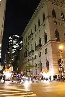 To the west, the clubhouse abuts the residences at 5, 7, 9–11, 13 and 15 West 54th Street and the Rockefeller Apartments, while to the north, it wraps around The Peninsula New York hotel at Fifth Avenue and 55th Street.[129][130] The clubhouse is also near Fifth Avenue Presbyterian Church and 712 Fifth Avenue to the north, the St. Regis New York hotel to the northeast, 689 Fifth Avenue and 19 East 54th Street to the east, the William H. Moore House to the southeast, and Saint Thomas Church and the Museum of Modern Art to the south.[129]