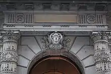 On the first story, there are six arched windows on 54th Street, three on each side of the decorative main entrance; there are also five similar windows on Fifth Avenue.[126][135][136] There are keystones above each of the window, which depict mythological characters such as satyrs, nymphs, and the gods Pan and Bacchus.[73] The 54th Street entrance consists of a massive arch flanked by a pair of rusticated columns, above which is a lintel,[123][126][135] as well as a carved head in the archway's keystone, which depicts Pallas.[76] The archway as a whole is designed in the Doric order. The columns consist of alternating sections with two primary motifs: decorated flutes and bands ornamented with foliage that encloses the club's monogram, as well as the initials of universities and colleges from which the club's members graduated. The entablature is adorned with triglyphs, metopes, and mutules, which are designed to harmonize with the columns.[135][136] The third-story mezzanine contains rectangular openings above each of the windows (eight on 54th Street and six on Fifth Avenue), which alternate with French's carved marble shields.[126][127][136] There are four shields each on 54th Street and Fifth Avenue.[137]