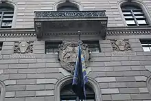 The original nine-story facade[lower-alpha 3] is clad with pink Milford granite.[125][127] The granite is divided into rusticated blocks, though the grooves of the rustication are less deep on upper stories.[127] The facade is divided into three tiers,[58][120][131][132] with horizontal band courses separating the bottom, middle, and top sections of the building.[123][125][126] Each of these sections, measuring three stories high, have double-height arched windows at the bottom.[125][127] There are also carved marble shields on the third and sixth stories, which depict the eighteen universities or colleges that most of the members attended. These universities are: Yale University, Princeton University, Cornell University, University of Pennsylvania, Columbia University, Harvard University, Dartmouth College, Brown University, Williams College, the United States Military Academy, the United States Naval Academy, City College of New York, Trinity College, Rutgers University, Union College, Amherst College, Hamilton College, and New York University. [76][127][lower-alpha 4] Beneath the shields are inscriptions with the universities' names in Latin, sculpted by Daniel Chester French.[127][133] These seals were commissioned at a cost of $1,000 each (equivalent to $35,176 in 2022) and were funded by members who were alumni of the respective colleges.[71] The corners of the building have slightly projecting rusticated piers reaching its full height.[134]