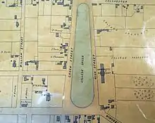1853 map of the University Green (formerly known as "College Green"). Main College (right), labeled "University of Vermont" is today known as the "Old Mill" building