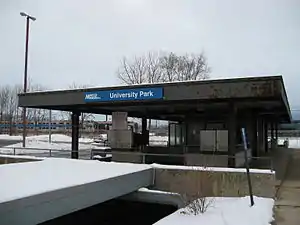 University Park is a station on Metra's Metra Electric District line located in University Park, Illinois. University Park is the southern terminus of the Metra Electric main line and is 31.5 miles (50.7 km) away from the northern terminus at Millennium Station.[1] The station is located on South Governor's Highway near West Stuenkel Road. In Metra's zone-based fare system, University Park is in zone G. As of 2018, University Park is the 64th busiest of Metra's 236 non-downtown stations, with an average of 808 weekday boardings.[2]